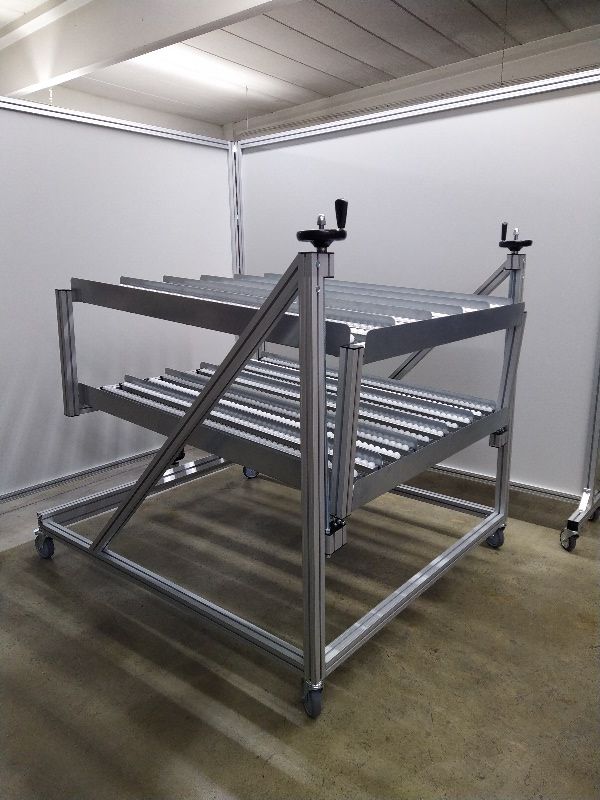 Höhenverstellbarer Arbeitsplatz mit Durchlaufregal