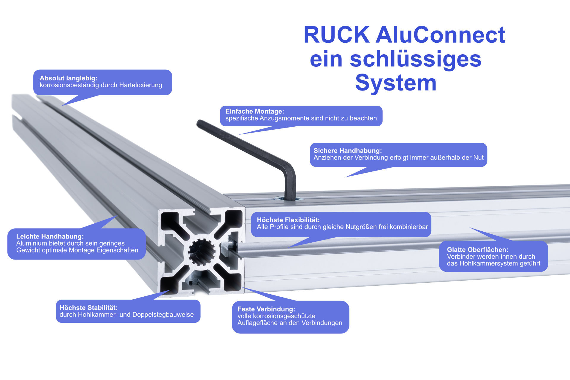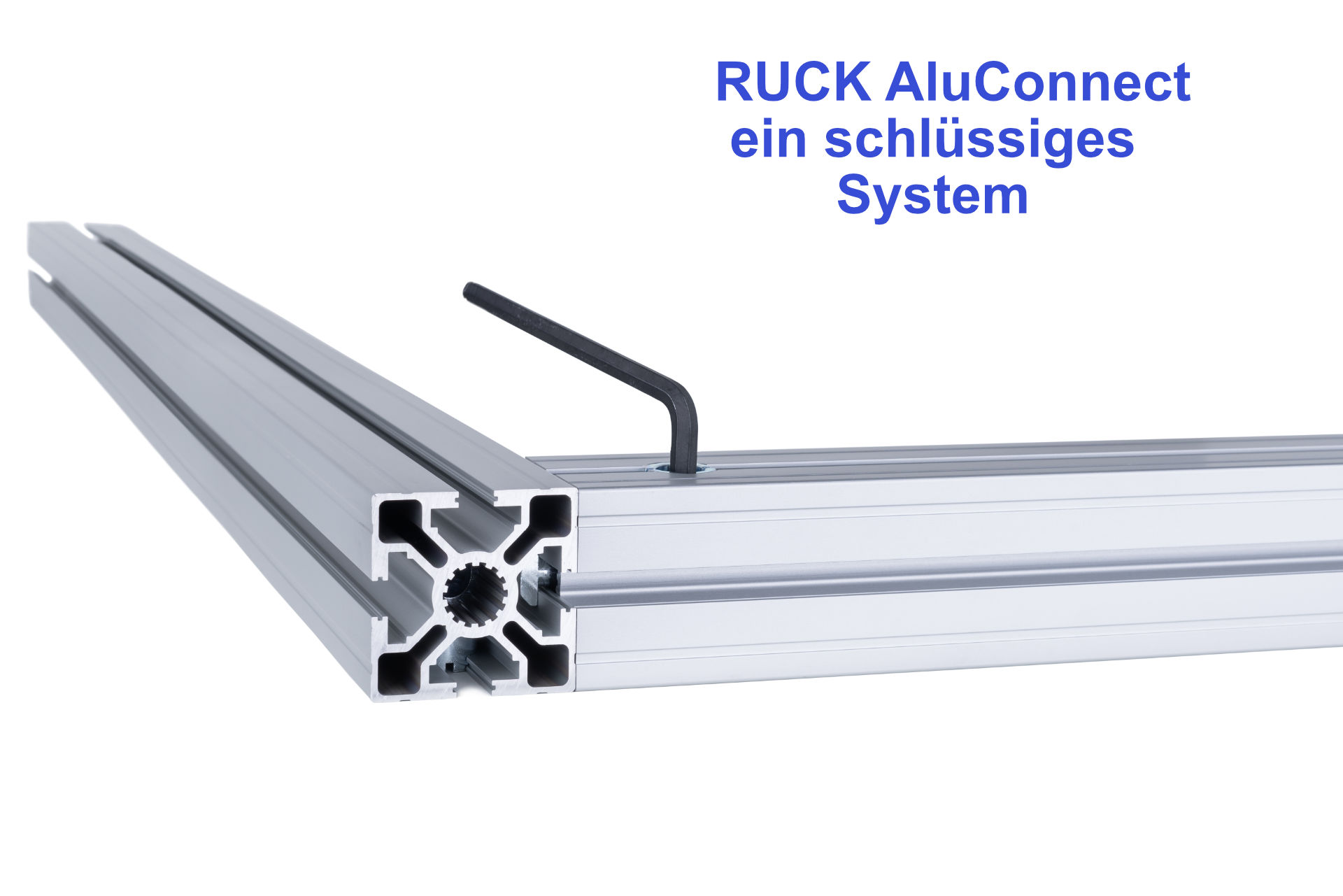 RUCK AluConnect Profile sind dank ihrer Hohlkammerbauweise auf höchste Belas tungen ausgelegt. Der Doppelsteg gewährleistet zudem an den Verbindungen die volle Aufl age und dadurch eine gleichmäßig hohe Belastung. Unsere kraftschlüssigen Profi lverbindungen sichern zusätzlich höchste Festigkeit für ein langes Leben in Ihrer Produktion.